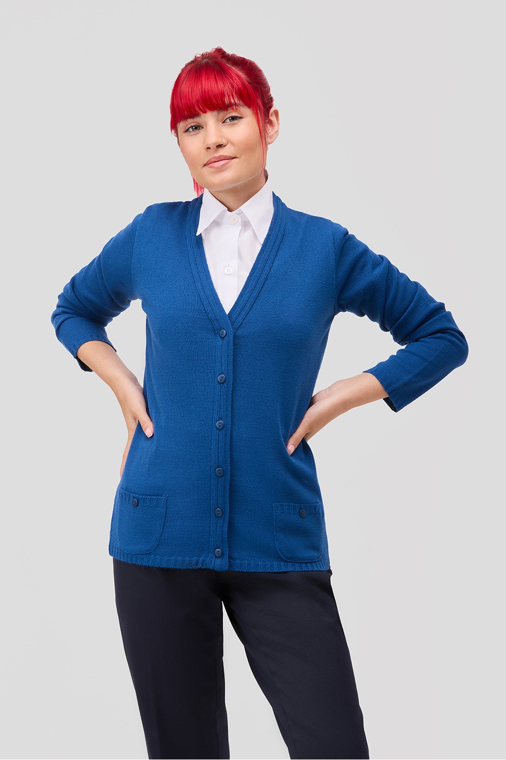 - Chaqueta de mujer con escote en V - Cierra central de botones - Bolsillos en la parte central con botón - Manga larga con puño acanalado - Bajo con acabados acanalados - Tejido de punto acrílico Low pillín - Disponible en cuatro colores