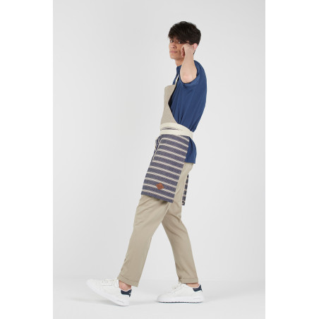 Delantal con peto rústico. La parte superior de tejido de saco se ajusta en el cuello con dos tiras correderas con apliques metálicos, la parte inferior de tejido de rayas tiene un bolso y se ajusta al cuerpo con dos tiras para anudar en la cintura.